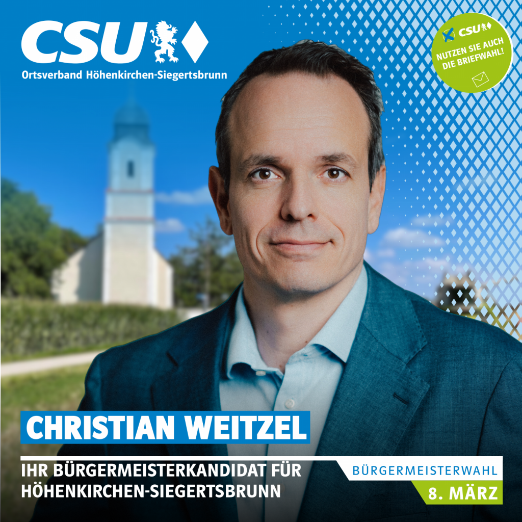 Auf seiner Sitzung am 07.08. hat der Vorstand der CSU Höhenkirchen-Siegertsbrunn einstimmig beschlossen, bei der Kommunalwahl 2026 mit Christian Weitzel als Kandidat für das Bürgermeisteramt in Höhenkirchen-Siegertsbrunn anzutreten. Christian Weitzel wird den Mitgliedern bei der Aufstellungsversammlung nach den Sommerferien zur Nominierung als Bürgermeisterkandidat vorgeschlagen.
